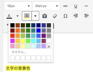 上の画像のようにボタンを押すと、文字の背景色を選ぶことができます。カスタムの色を追加することも可能です。強調したい時などに使います。